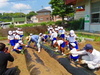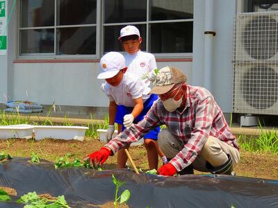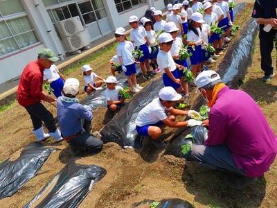 地域のボランティアの方々は、今回だけでなく、畑の耕し、除草、畝作り等、今回の苗植えに至るまでの下準備も、貴重な休日にしてくださいました。本当に児童とともに感謝しています。ありがとうございました。