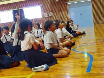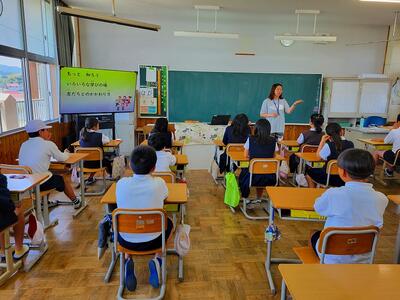 ②では、「人それぞれ苦手なことは違うので、その違いを認め合って、やさしい言葉かけができる温かい雰囲気をつくっていきたいこと」、「子どもたちは、みんな幸せに生きる権利があるから、いじめは絶対にいけないこと」、「みんなで楽しい門川小をつくっていきたいこと」を伝えました。