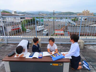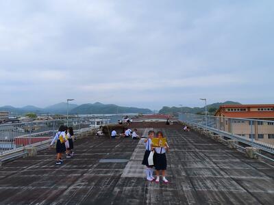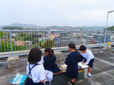 4月22日(火)は、北校舎屋上に行き、学校のまわりを実際に見ながら調べました。子どもたちから「東には海があった。」「南に、まつのや発見!」「図書館は、北ですか。西ですか。」など、たくさんの声が聞かれました。みんな一生懸命に見付けたものをメモしていました。屋上に行く機会もなかなかないので、子どもたちにとって新鮮な学習だったようです。