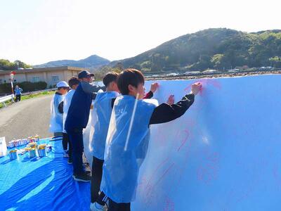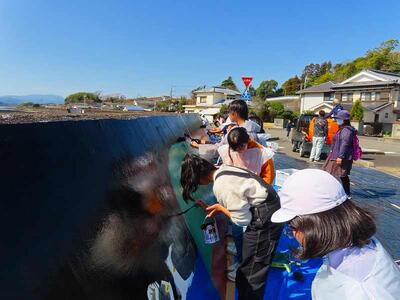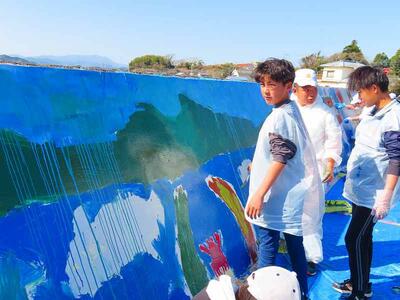 3月4日(水)は、「私たちのふるさと門川町」をテーマにして、国指定天然記念物のカンムリウミスズメや門川湾に浮かぶ無人島である乙島、門川町の自然や生き物、だんじり祭り、花火大会等、児童が思う「大好きなふるさと門川町」が次々と描かれていきました。小学校最後の大きな行事として、みんなで筆を執り、堤防を色鮮やかに彩ったことは、児童にとって最高の思い出になりました。