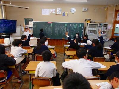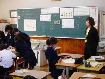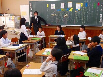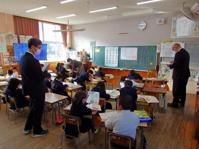 2校時以降は、授業を参観していただきました。宮崎県は、児童の学びの方向性を整理した「ひなたの学び」の取組を推進しています。その中の「な」である「なかまとなって学び合い」を、門川小学校の授業では特に研究しています。いろんな人とつながり、学び合い、考えを広げる学習(対話的な学び)です。