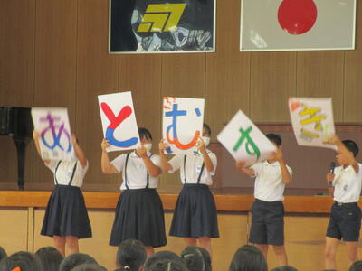 発表方法としては、写真やポスターを提示したり、合い言葉を確認したり、短い劇を発表したりなど、それぞれの委員会の工夫が出ていました。「知恵いっぱい 心いっぱい 汗いっぱい」の門川小学校の児童であってほしいと思います。