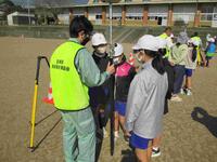 測量設計協会の皆さんからは、実際に目で見て測量する方法とGPSを利用しての測量方法を体験させていただきました。遠くの目印までの距離や高さが瞬時に分かったり、運動場に打ち込んで土でかぶせていたピンの在処がぴったりと分かったりして、児童は驚いていました。