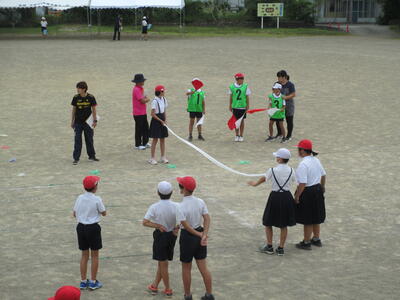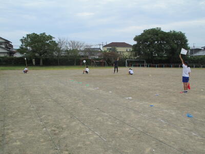 「決勝審判」は、決勝テープの持ち方や離し方、着順を示す赤白旗の上げ方を、実際に児童に走ってもらって練習をしていました。