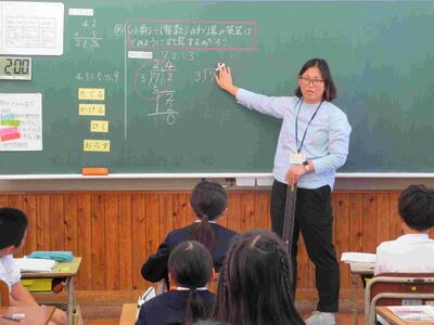 4年2組は、算数科でした。整数の筆算の仕方をもとに、7.2÷3や37.5÷5等の(小数)÷(1桁の数)の筆算の仕方を考え、計算に取り組む学習でした。次第に難度(レベル)が上がっていく筆算問題に、集中力を切らさずに楽しみながらチャレンジしていました。