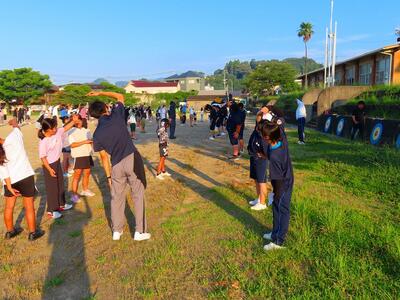 嬉しいことに、今年度も門川中学校や門川高等学校の生徒さんたちがボランティアで来てくださいました。児童を行政地区ごとに整列させたり、最前列で模範演技をしたりしてくださいました。とても上手でした。特に、「ラジオ体操第二」は、小学生にとってあまり馴染みがない動きなので、注目の的でした。