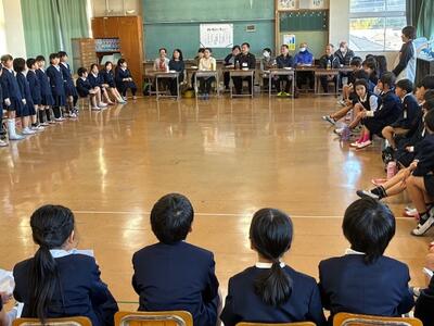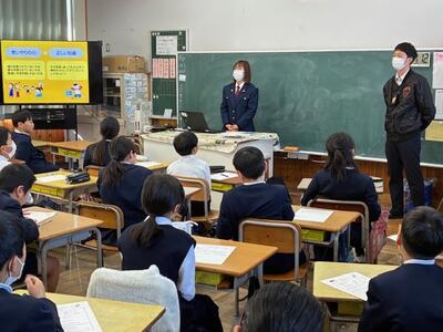 ・学級活動で、日向警察署少年係の方々に講師として来ていただき、「ITモラル」についての非行防止教室を行っていました。