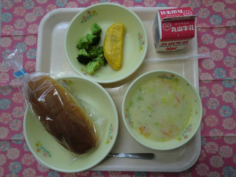 【献立】 チーズパン・ツナマヨオムレツ・ブロッコリー・豆乳スープ・牛乳