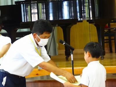まず、2・4・6年生の代表児童が1学期にがんばったことをそれぞれ発表しました。2年生は、あいさつをがんばったこと、4年生は、算数の学習と家庭学習をがんばったこと、6年生は朝のボランティア活動と読書をがんばったことを具体的にハッキリとした声で発表しました。