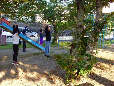 漁港近くの海の見える公園には、11人(子ども5人+大人6人)が集まり、大人6人の中には保護者だけでなく、区長さんや民生委員児童委員、地区の高齢者の方々も参加され、アットホームな空気に包まれていました。