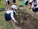 学級花壇に花を植えました。どの学級花壇も色とりどりでにぎやかです。大事に育てていきたいですね。
