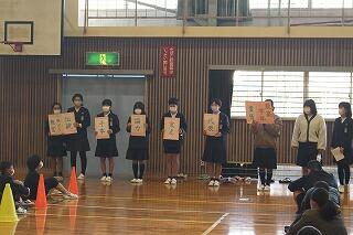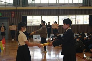6年生から5年生へ「代表」「支え」「協力」「手本」「伝統」「責任」の6つの言葉を贈りました。