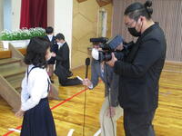 始業式の終わりには、個別に6年生2名が取材を受けました。とても緊張する場面でしたが、自分の考えをはきはきと記者に伝えることができていて立派でした。
