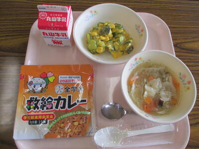 災害は突然起きます。日頃の備えがとても大切です。それに関連して、この日の給食は、いつもと一部が違っていました。下の写真がその日の献立ですが、どこが違うと思われますか?