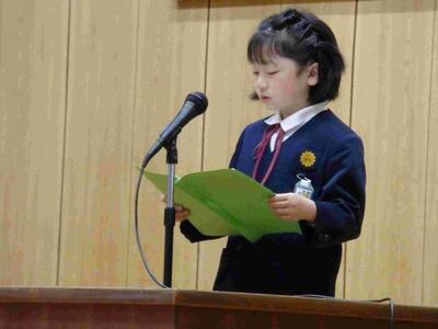 3年生は、「2年生のときよりも友達をたくさんつくる。」、「立腰の姿勢と無言が、1・2年生のお手本になれるようにがんばる。」、「理科や、算数のわり算が楽しみ。」ということを、落ち着いた声で堂々と発表しました。