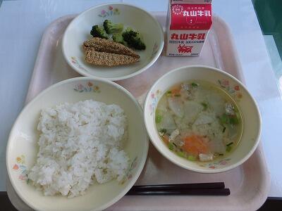 麦ごはん・いわしのごま衣揚げ・さつま汁・ブロッコリー・牛乳