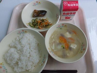麦ごはん・切り干し大根の牛乳煮・里芋のごま味噌和え・果物・牛乳