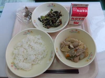 麦ご飯・ちりめん佃煮・野菜の味噌煮・小松菜の磯和え・牛乳
