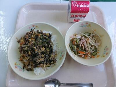 ビビンバは、韓国料理の混ぜご飯のことです。「ピビン」は混ぜ合わせるという意味で,「パプ」はご飯のことです。御飯の上に何種類ものナムルや 肉,卵等の具をおき,よく混ぜ合わせて食べます。ナムルとは、野菜や山菜をゆでて、調味料とごま油で和えたもののことです。今日のビビンバには、牛肉、卵、ぜんまい、しいたけ、にんじん、もやし、ほうれん草、ねぎ等たくさんの材料が入っています。