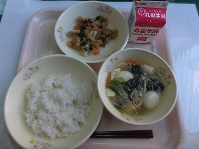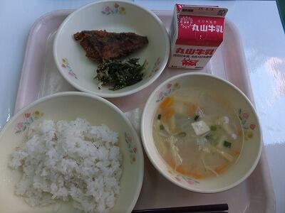 麦ご飯・卵焼き・ほうれん草と沢庵の胡麻和え・石狩汁・牛乳