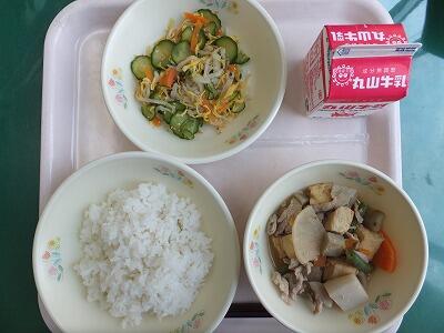 《今日の献立》麦ご飯・筑前煮・へべす味噌和え・牛乳