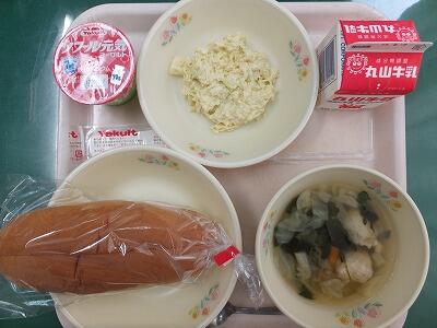 《今日の献立》マヨネーズパン・魚の変わり揚げ・ボイルキャベツ・野菜のクリームスープ・牛乳
