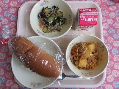 【献立】黒糖パン・肉と野菜のカレー煮込み・海藻サラダ・牛乳