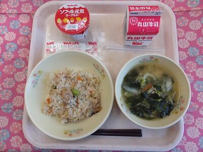 【献立】黒糖パン・ポテトのマリアナソース・チンゲン菜のかきたま汁・牛乳