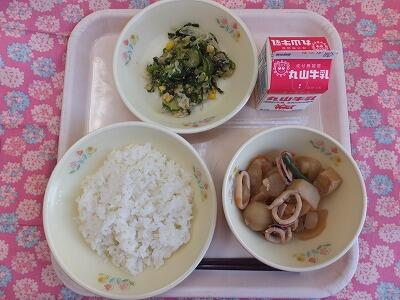 【献立】麦ごはん・いかと大根の煮つけ・ごまじゃこ和え・牛乳