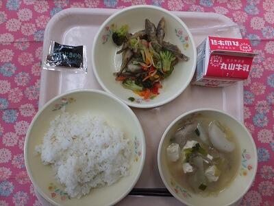 【献立】麦ごはん・いわし生姜煮・ゆかり和え・団子汁・牛乳