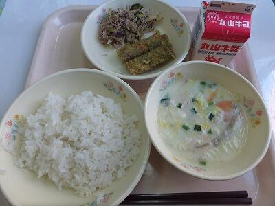 麦ごはん・竹輪の磯辺揚げ・ゆかり和え・あすか汁・牛乳