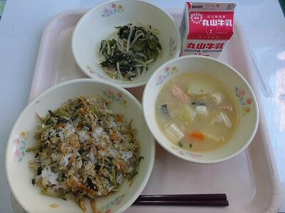 菜飯・道産子汁・もやしのごま醤油・牛乳