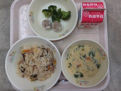 《今日の献立》キムチチャーハン・シュウマイ・ブロッコリー・かにとチンゲンサイのスープ・牛乳