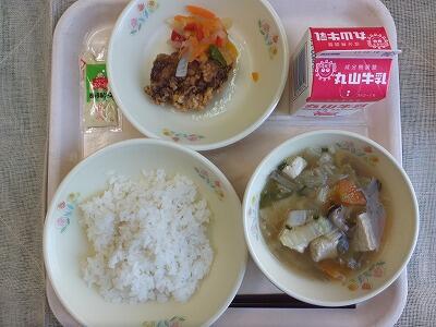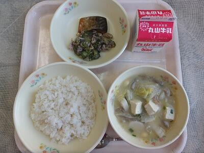 《今日の献立》麦ご飯 さばみぞれ煮 ゆかりあえ 豆豚汁 牛乳