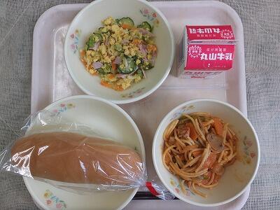 今日のひじきスパゲティは、ひじきやさつま揚げ等を炒めてしょうゆで味付けした和風のスパゲティです。学校給食のスパゲティは麺の量が普通のスパゲティの1/3で、鶏肉やさつま揚げ等・体をつくる赤の食品が多いので主食と主菜を兼ね備えた料理として出しています。スパゲティの量が少ないので小さめのパンを付けています。野菜が足りないのでサラダと組み合わせました。給食の野菜量を参考にお家でも毎食しっかり野菜を食べましょう。