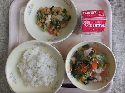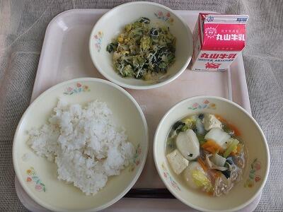 冬は鍋料理の季節です。鍋に入れる白菜は冬が旬です。また、今日のごまじゃこ和えには、今が旬のほうれん草が入っています。白菜にはビタミンC、ほうれん草にはカロテンやビタミンCがたくさん入っていて、風邪の予防に役立ちます。お家でも旬の野菜を意識して食べるようにしましょう。