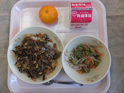 《今日の献立》三色そぼろ ぼったり汁 みかん 牛乳