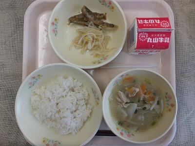 《今日の献立》麦ご飯 めひかりの蒲焼き もやしの酢醤油 さつま汁 牛乳