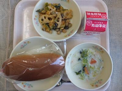 《今日の献立》黒糖パン スイートポテトシチュー 海藻サラダ 牛乳