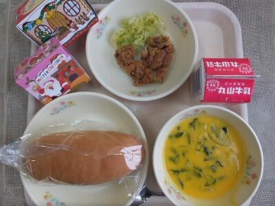 《今日の献立》減量コッペパン 唐揚げ ボイルキャベツ パンプキンスープ クリスマスケーキ 牛乳