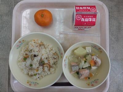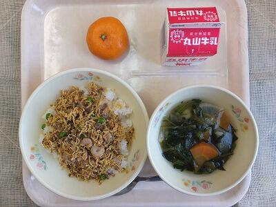 《今日の献立》野沢菜ごはん 豆豚汁 フルーツのオレンジソースかけ 牛乳