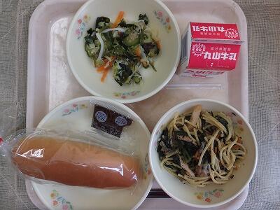 《今日の献立》減量コッペパン チョコマーガリン ひじきスパゲティ 海藻サラダ 牛乳
