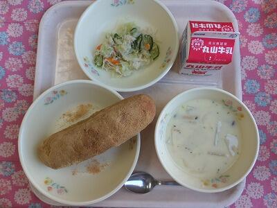 【献立一口メモ】クラムチャウダーとは、あさりなど2枚貝の入ったスープのことです。今日の給食には、あさり、貝柱、ベーコン、玉ねぎ、にんじん、じゃがいも、ブロッコリー、パセリ、牛乳等、多くの種類の食材が入っています。ファストフードで、ハンバーガーを注文する時は、フライドポテトやシェイクではなく、具材の多いスープやサラダを組み合わせるようにしましょう。
