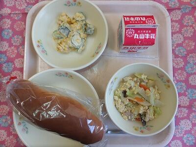 【献立】マヨネーズパン・牛肉とマカロニのトマト煮・スタミナサラダ・牛乳