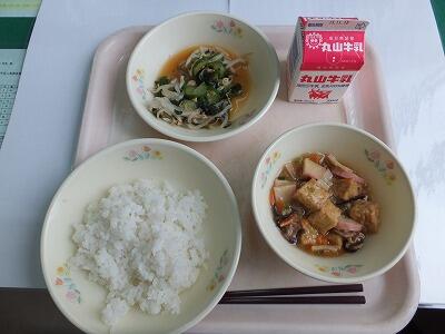 麦ご飯・厚揚げの中華煮・キムチ和え・牛乳