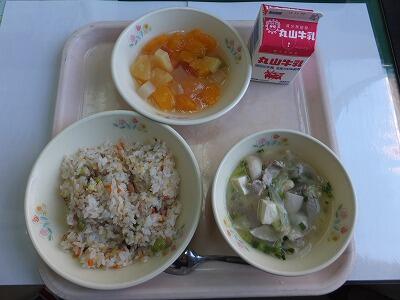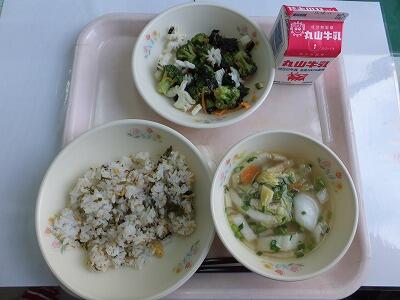 菜めし・から揚げ・キャベツ・小松菜のすまし汁・デザート・牛乳