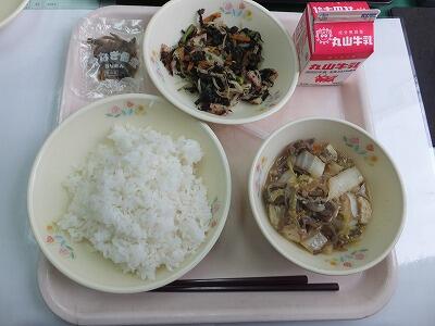 今日から1週間、給食の食べ残しがどれだけあるか調査します。自分の嫌いなものは食べないという人はいませんか。現在、生活習慣病で亡くなったり、苦しんだりする人が増えています。学校給食は好きなものだけが出るレストランではありません。皆さんが生涯健康でいるために何をどれだけ食べればよいのか知るための見本です。自分が嫌いなものは少なくしたり、好きなものは多くするということでは、自分の適量を知ることが出来ません。出来るだけ同じようについで、どれだけ食べなければならないかが分かるようにしましょう。