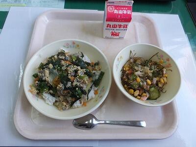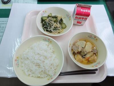 今日の給食は和食です。和食は、脂肪分が少なく健康に良い食品がたくさん使われています。今日の給食は、ご飯、煮物、和え物、汁物という組み合わせで、使われている材料は野菜がたっぷりです。野菜には、体の中にたまった老廃物を体の外に出しお腹の掃除をしてくれる食物繊維がたくさん含まれています。