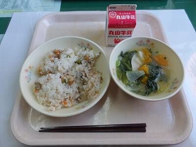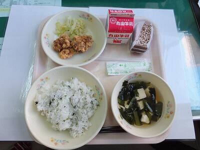 菜めし・から揚げ・キャベツ・小松菜のすまし汁・デザート・牛乳