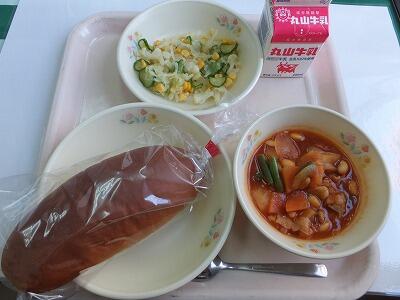 ミルクパン・ポークビーンズ・スタミナサラダ・牛乳
